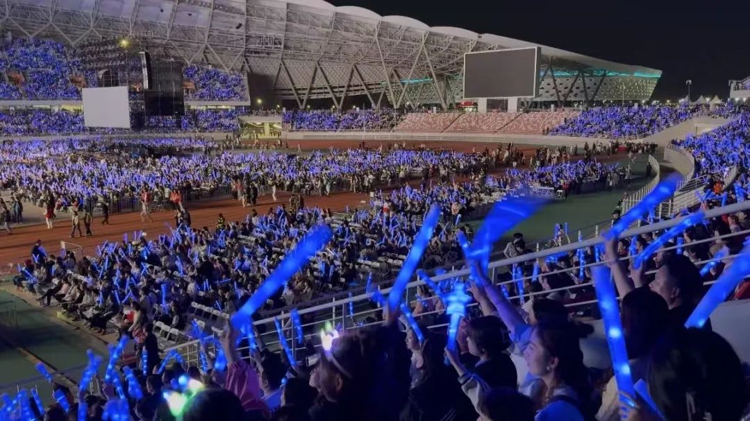 觀眾手持熒光棒,將夜空點亮成一片璀璨燈海。圖源:浩然東津