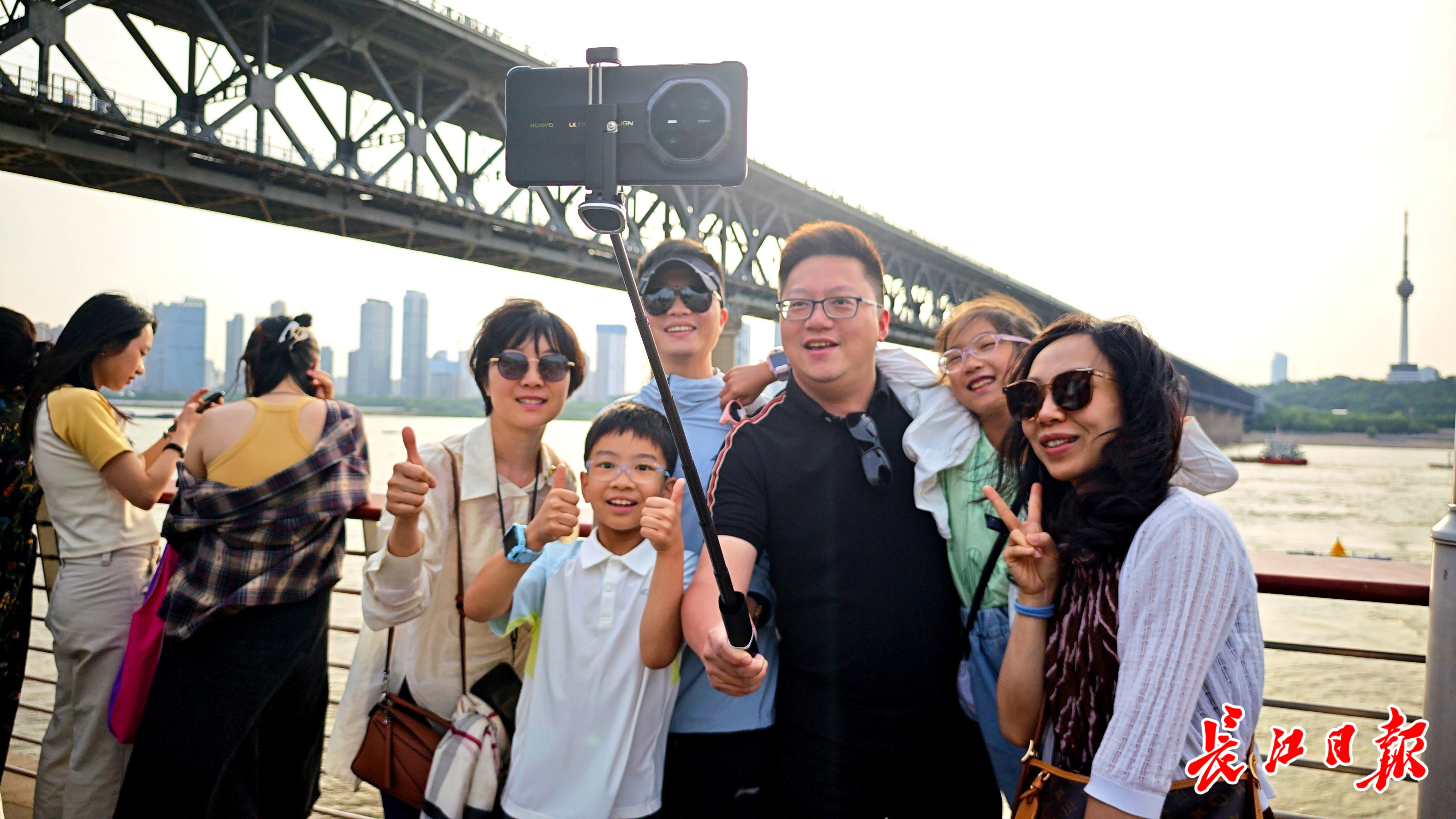 外地游客在武昌江灘觀江看橋。