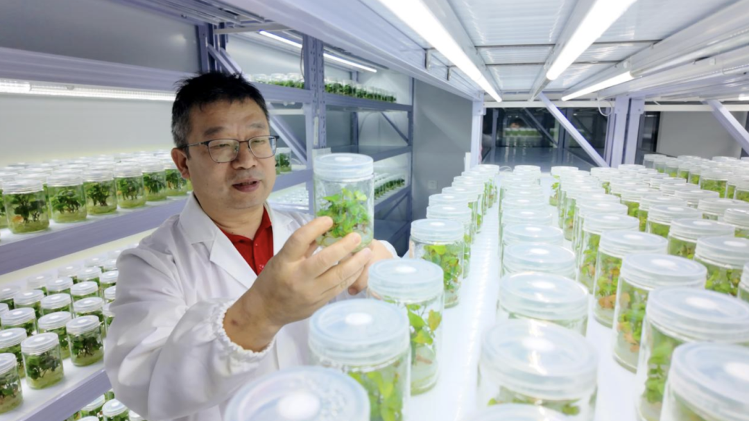 蔡興奎在紅安瑞灃紅薯組培脫毒種苗繁育中心察看紅薯組胚苗生產情況。