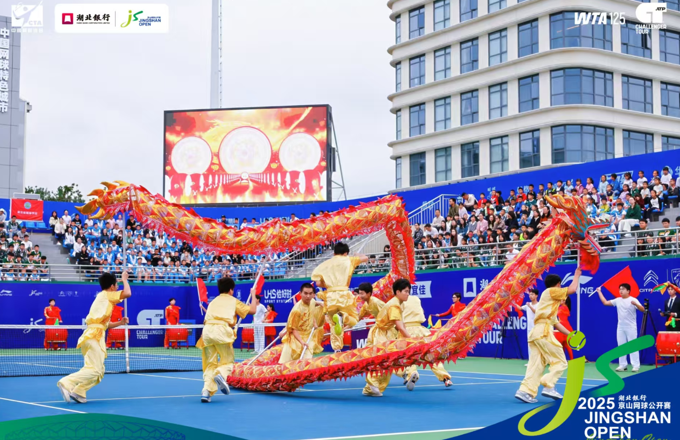 翌日清晨,徐波率京山英才學校一百二十余名熊門校園傳承弟子,登臺京山網(wǎng)球公開賽開幕式。在國際網(wǎng)球協(xié)會官員、國家體育總局網(wǎng)球運動管理中心領導、中國體育場館協(xié)會代表、華體集團負責人,以及湖北省、荊門市各級領導與各國參賽運動員、現(xiàn)場觀眾的共同見證下,展演熊門特色“龍舞”,熊門龍舞融入“龍形拳”技法,舞龍者運用熊門“盤、纏、翻、轉(zhuǎn)”身法,龍舞翻飛,氣騰云霄,其獨特的文化魅力與武術底蘊,獲現(xiàn)場各界人士高度贊譽,成為開幕式上展現(xiàn)中華傳統(tǒng)武術文化的亮眼名片。