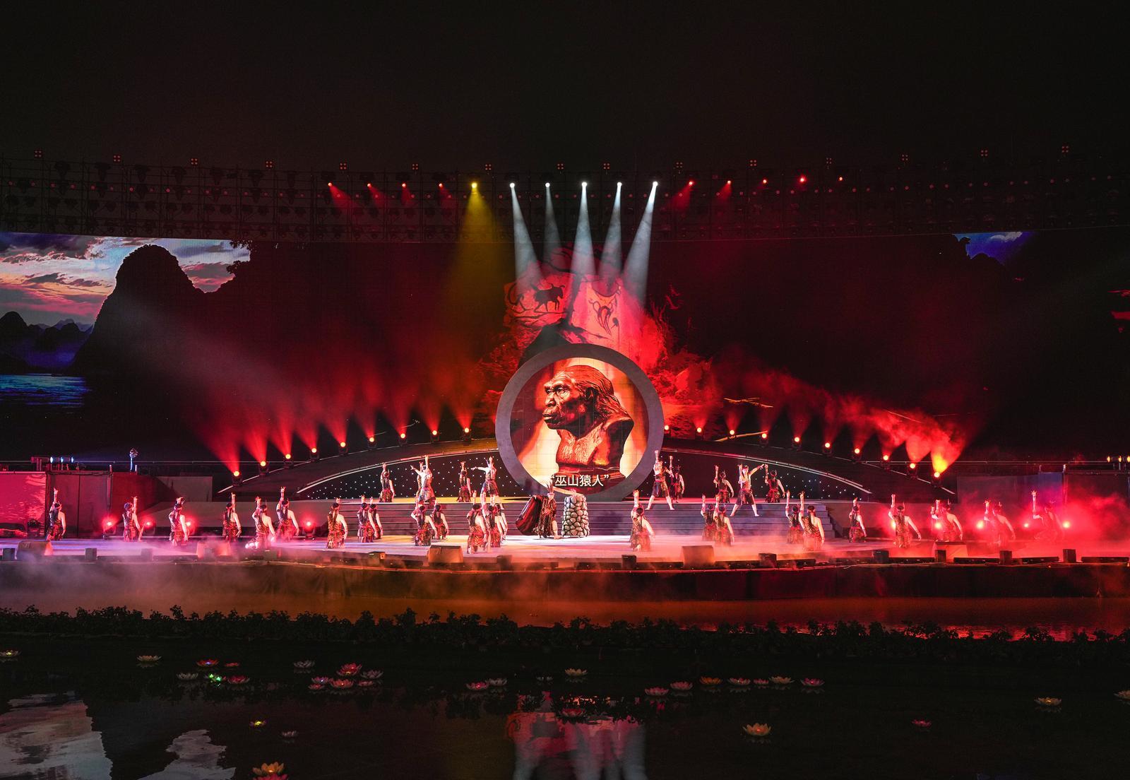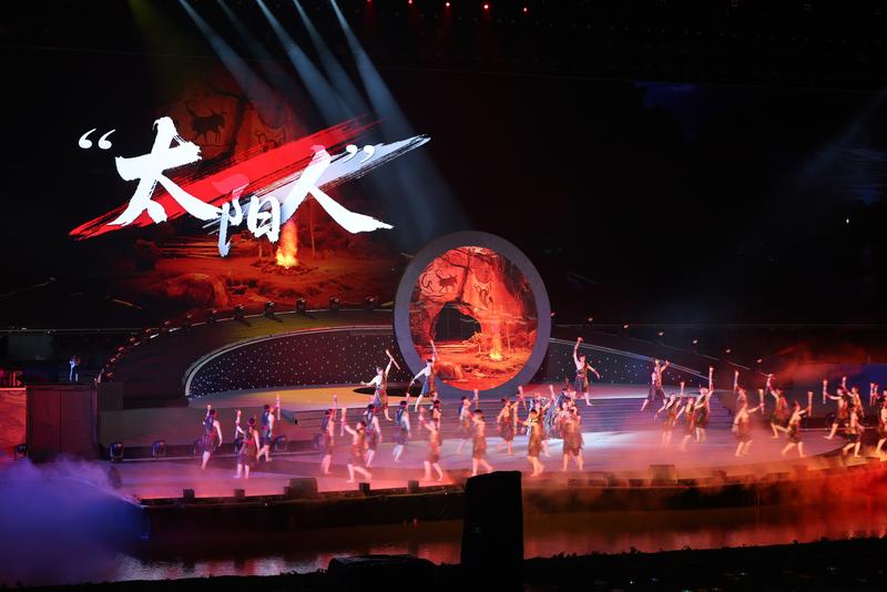 燈光漸隱,時(shí)空回溯,觀眾遁入蒼茫遠(yuǎn)古?!拔咨皆橙恕薄伴L(zhǎng)陽(yáng)人”“太陽(yáng)人”石刻等依次登場(chǎng)。創(chuàng)意舞蹈《太陽(yáng)人》以時(shí)間為軸,舒展開長(zhǎng)江三峽的文明史詩(shī)。