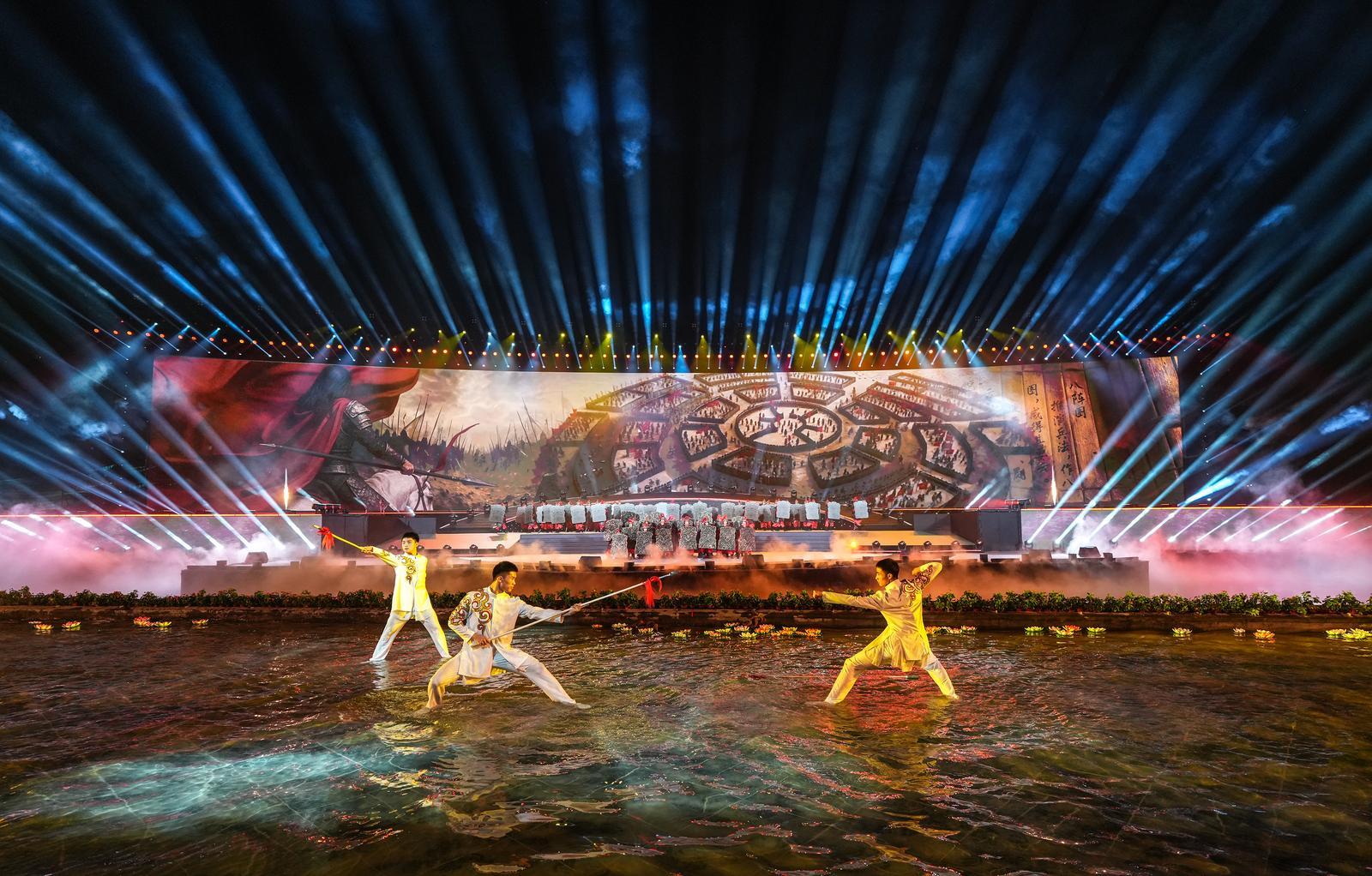 水上舞臺(tái),波光粼粼。前區(qū),白衣武者執(zhí)矛起舞,剛?cè)岵?jì);中區(qū),鎧甲舞者持盾列陣,氣勢(shì)如虹??罩?,無(wú)人機(jī)群與舞臺(tái)默契呼應(yīng),變換出古老神秘的“八陣圖”,再現(xiàn)諸葛亮運(yùn)籌帷幄、決勝千里的智謀傳奇……