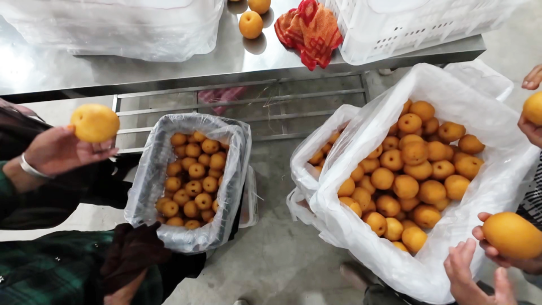 從曬谷場(chǎng)往村外走不遠(yuǎn),連片的金果梨基地映入眼簾,碩大的果實(shí)掛滿枝頭,村民們穿梭在果樹間,熟練地采摘成熟的金果梨,隨后運(yùn)往基地配套的冷庫儲(chǔ)存。