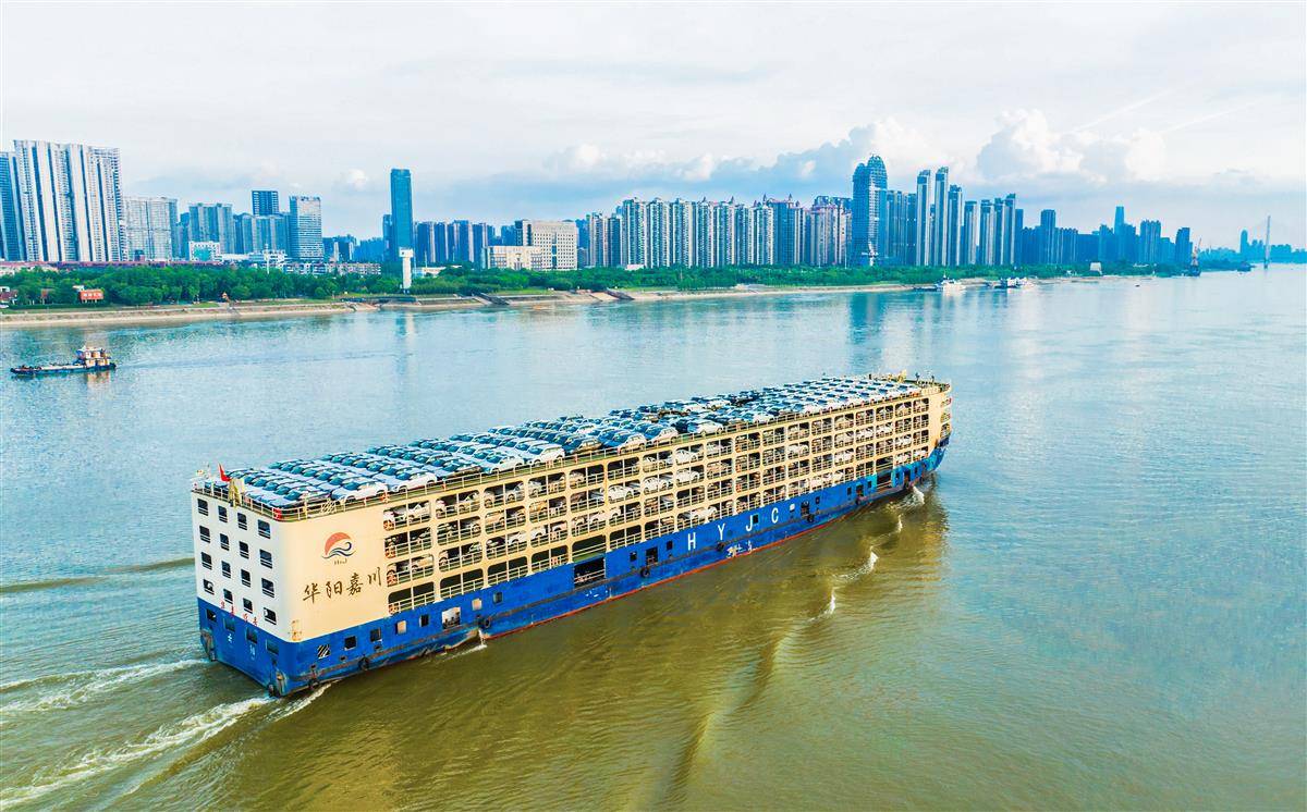 滿載汽車的貨輪行駛在長江武漢段。(湖北日?qǐng)?bào)全媒記者 薛婷 攝)