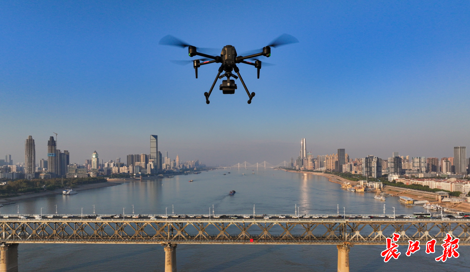 普宙科技無人機在武漢長江大橋上空往上、下游方向進(jìn)行測繪、巡檢。 長江日報記者胡冬冬 攝